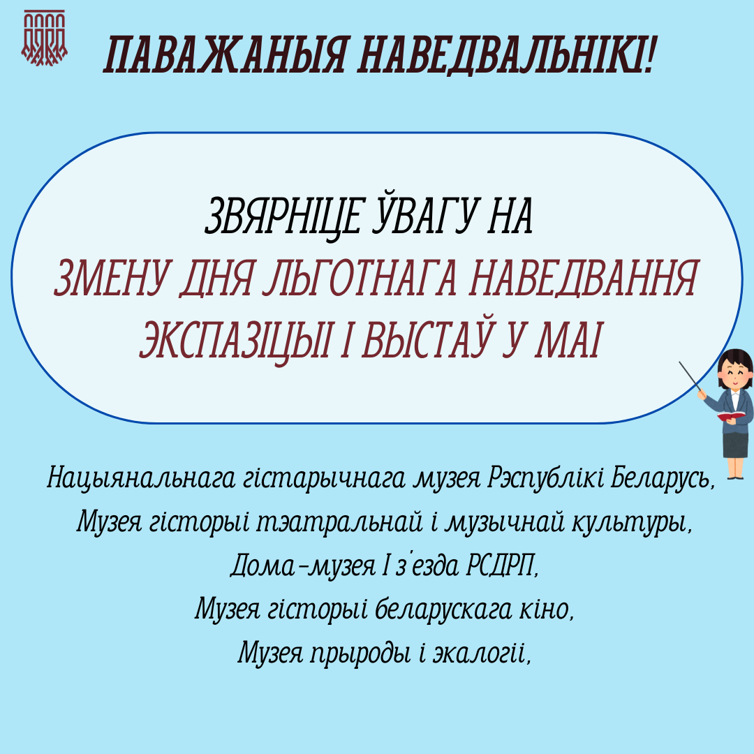 Інфармацыя для наведвальнікаў аб часе працы, паслугах і іх кошце Нацыянальнага гістарычнага музея Рэспублікі Беларусь