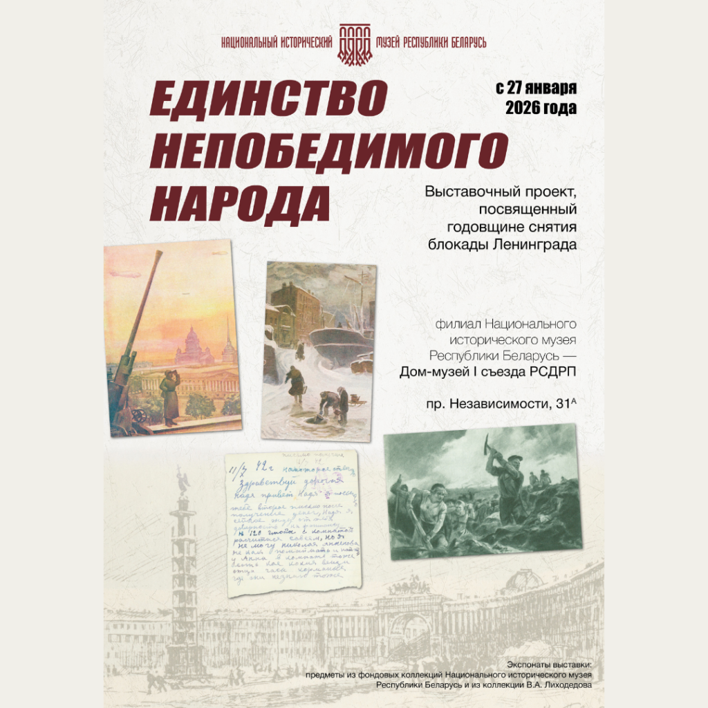 27 студзеня 2026 года ў 17.00 ў Доме-музеі І з’езда РСДРП – філіяле Нацыянальнага гістарычнага музея Рэспублікі Беларусь, адбудзецца адкрыццё выставы “Адзінства непераможнага народа”. У аснове выставачнага праекта – экспанаты з фондавых калекцый Нацыянальнага гістарычнага музея Рэспублікі Беларусь і матэрыялы беларускага гісторыка Уладзіміра Аляксеевіча Ліхадзедава.