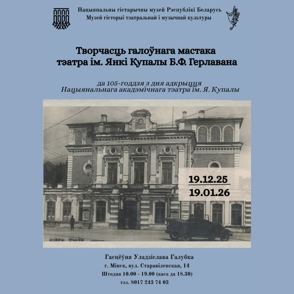 19 снежня ў Гасцёўні Уладзіслава Галубка пачынае працу часовая экспазіцыя “Творчасць галоўнага мастака тэатра ім. Янкі Купалы Б.Ф. Герлавана”, прысвечаная 105-годдзю з дня адкрыцця Нацыянальнага акадэмічнага тэатра імя Я. Купалы.