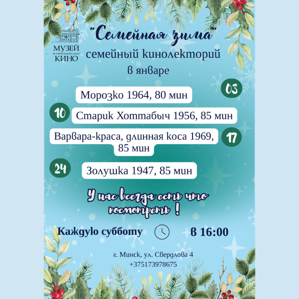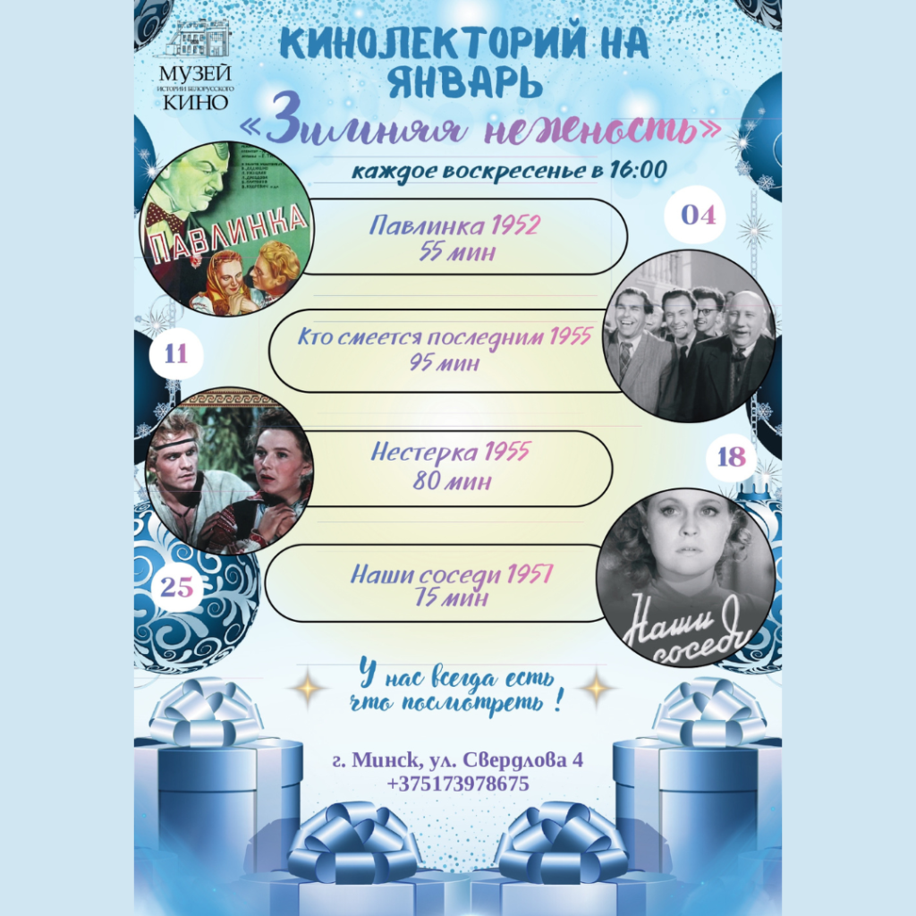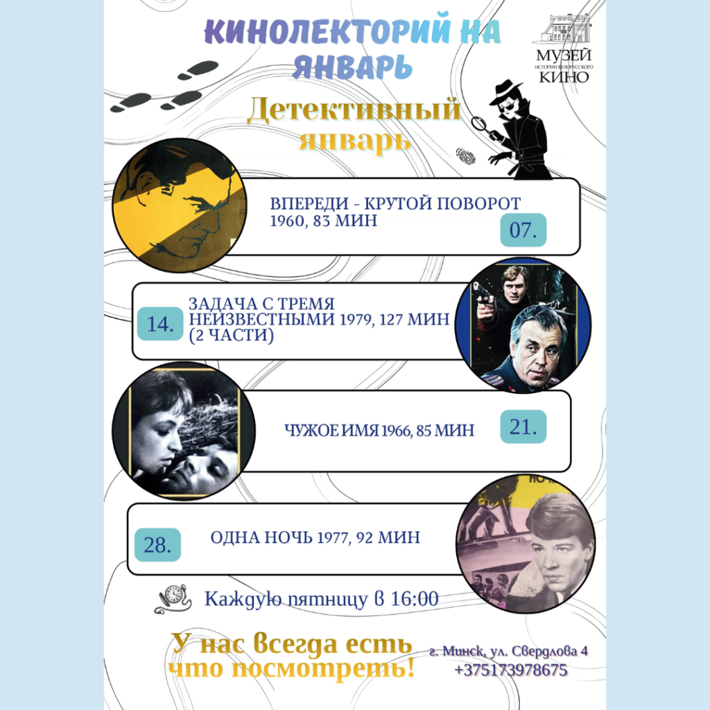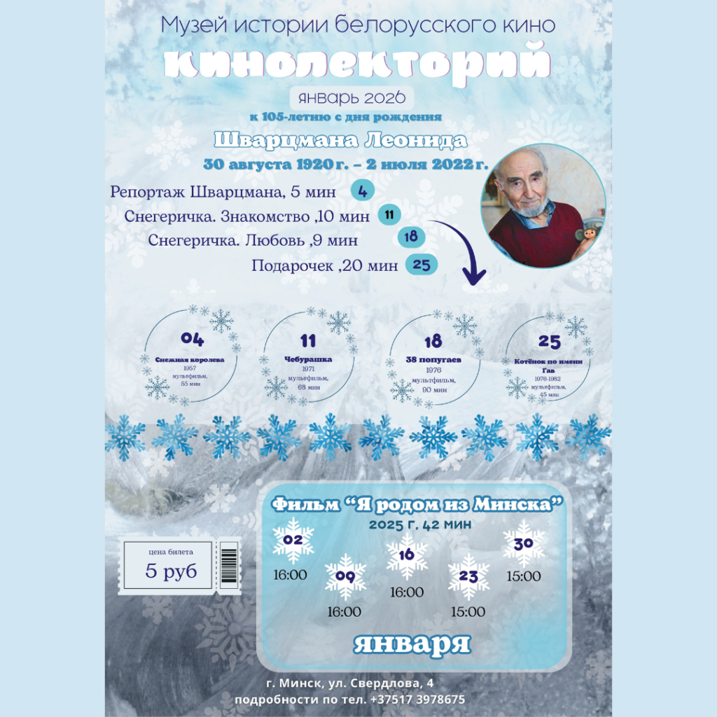 Музей гісторыі беларускага кіно запрашае на тэматычныя кіналекторыі ў студзені!08.01.2026 ← Вярнуцца да спісу Падзяліцца